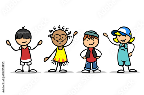 Vier multikulturelle Cartoon Kinder stehen in einer Reihe