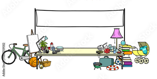 Leeres Banner mit Spielzeug und Trödel für Flohmarkt