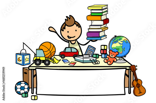 Cartoon Junge verkauft Bücher auf Flohmarkt für Kinder