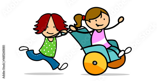 Mädchen schiebt ihre Freundin im Rollstuhl beim Spielen