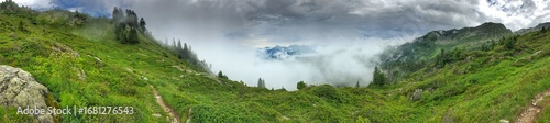 Panorama among clouds in the French Alps mountains