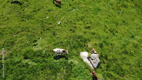 Aerial View of Cows Grazing Peacefully on a Lush Green Pasture in the Austrian Alps