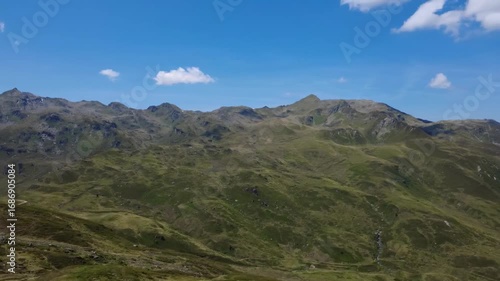 Drone Pan View of Majestic Austrian Alps in Summer with Lush Green Slopes and Clear Blue Sky.