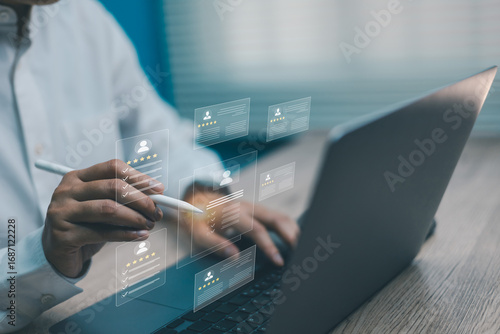Businessman analyzing digital profile with rating and review system on virtual screen,Concepts of HR recruitment, customer feedback, online survey, and digital evaluation #1687122228