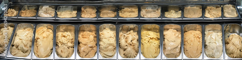 Top view of a single scoop of dulce de leche ice cream with caramel sauce on white background