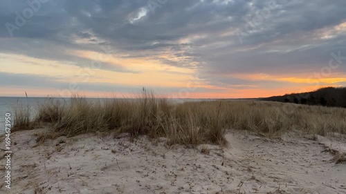 Pan shot of sunset over the Baltic Sea: beach, sand dunes, and beach grass at Graal-Müritz, Germany.