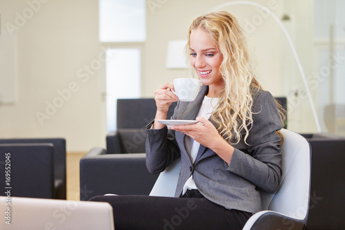 Junge Geschäftsfrau trinkt eine Tasse Kaffee