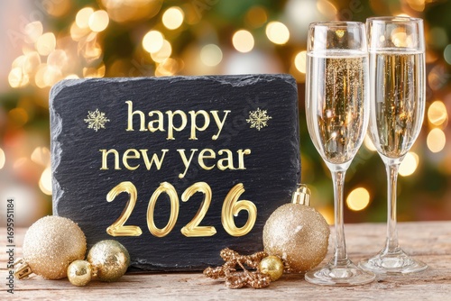 Festive New Year 2026 celebration with champagne glasses and gold decorations