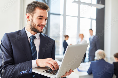 Geschäftsmann mit Laptop Computer online