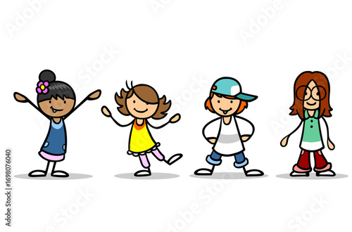 Vier Cartoon Kita Kinder stehen nebeneinander in Reihe