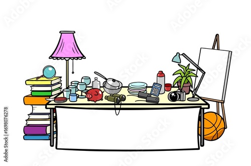 Einladung für Kinderflohmarkt mit Trödel auf Tisch