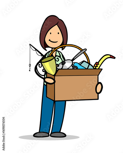 Cartoon Frau trägt Karton mit Trödel zum Flohmarkt