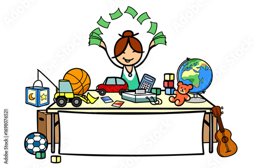 Cartoon Kinder verdienen Geld mit Spielzeug verkaufen auf Flohmarkt