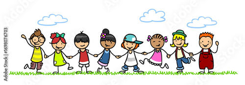 Gruppe Cartoon Kinder halten Hände auf Wiese
