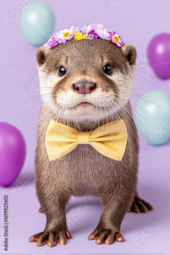 Adorable otter wearing a golden bow tie and floral crown at a celebration