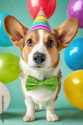 Playful corgi in a party hat surrounded by colorful balloons and joy