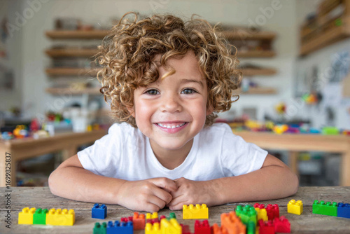 Smiling child playing with colorful building blocks in a creative classroom