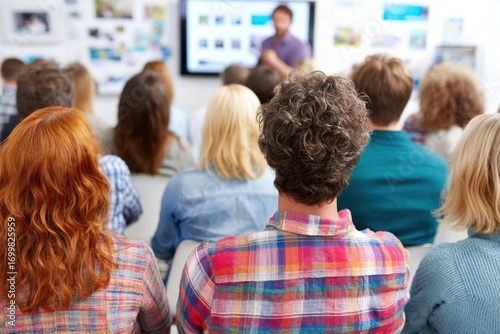 Confident researcher presenting a colorful case study on a projector screen to an attentive audience