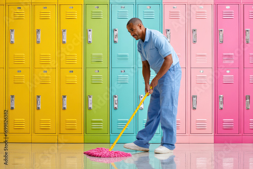 Professional cleaning worker mopping floor in brightly colored locker hallway