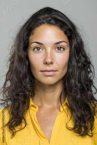 Female Brazilian photo ID passport portrait wearing a yellow shirt, front-facing view