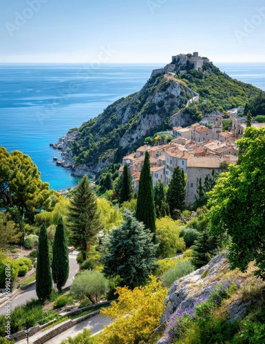 Scenic coastal village with historic castle and lush greenery under blue skies