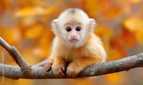 Golden-haired baby monkey perched on a branch with autumn background