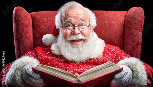 Smiling Santa Claus reading a book in a festive red armchair