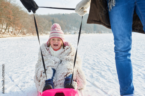 Familie hat Spaß beim Schlitten fahren und rodeln