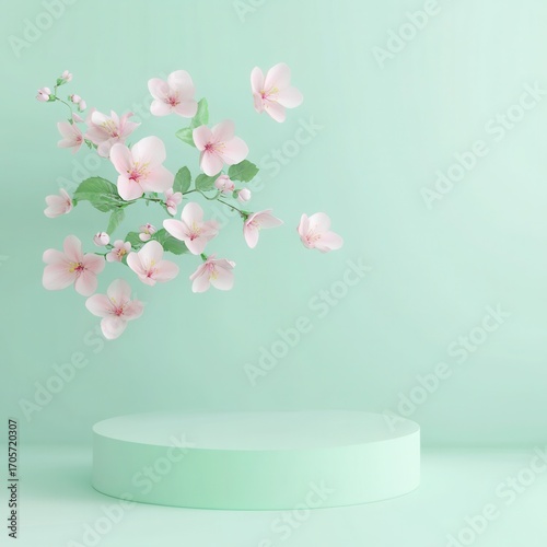 Minimal scene with flying cherry blossoms on mint green pastel background