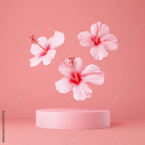 Minimal pink podium with hibiscus flowers in a floating decorative setup