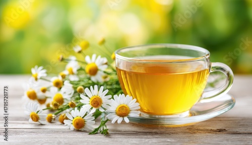A cup of chamomile tea with fresh flowers on a sunny background