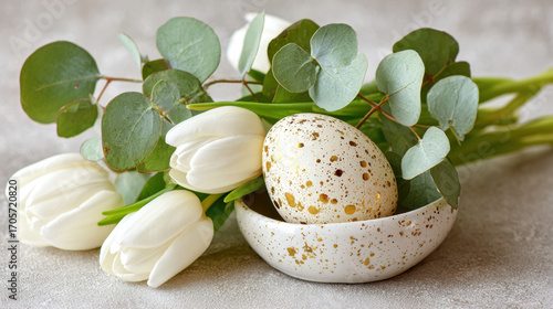Decorative speckled Easter eggs and spring blossoms on a soft pastel background