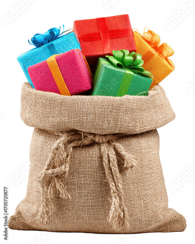 PNG burlap sack holding vibrant wrapped gifts isolated on a white background