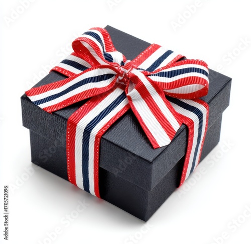 Elegant black gift box with red, white, and blue ribbon decoration