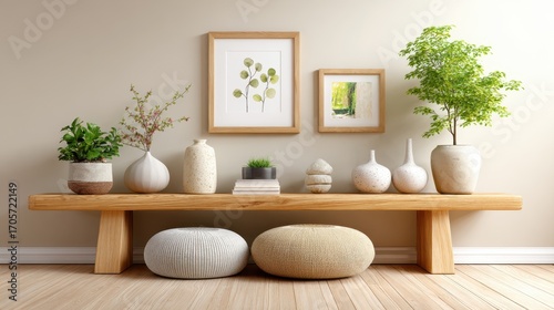 Minimalist Japanese-style interior with wooden bench and natural decor elements