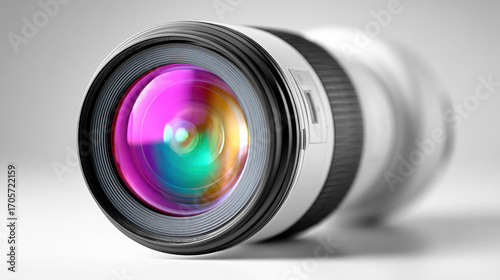 Close-up of a professional white telephoto lens with vibrant reflections