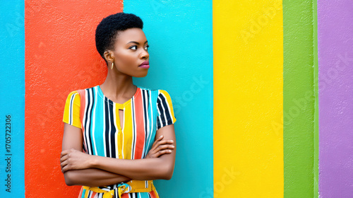 Colorful portrait of a thoughtful woman against a vibrant striped wall