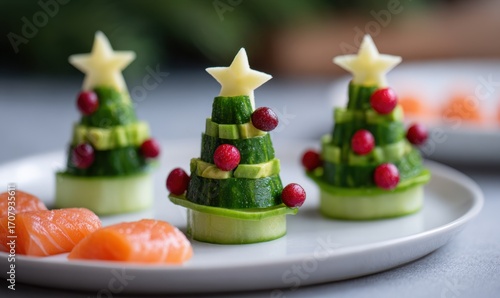 Festive cucumber and salmon appetizers shaped like Christmas trees