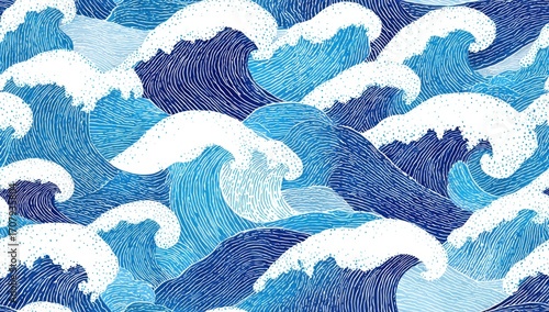 Seamless pattern of artistic ocean waves with detailed blue and white design
