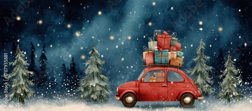 Whimsical winter scene with red car and Christmas gifts on snowy road