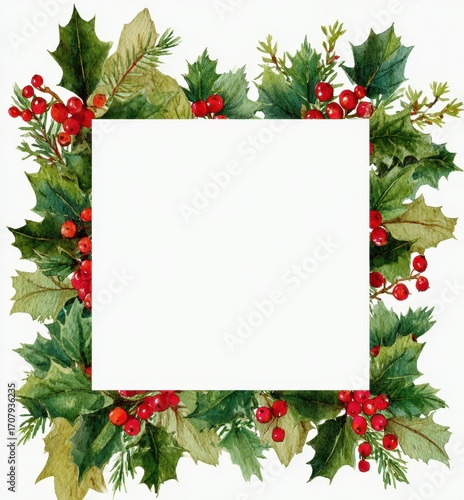 Watercolor Christmas frame with holly, pine branches, and berries