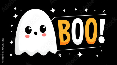 Cute ghost with a speech bubble saying boo on a black background