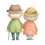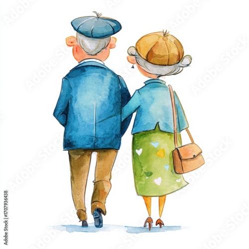 Elderly couple walking together in charming watercolor artwork