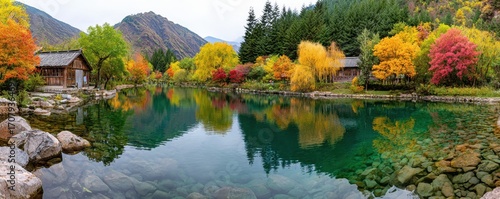 Serene autumn lake with vivid colors and a cozy wooden cabin
