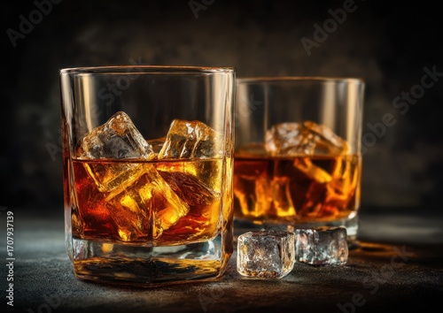 Two whiskey glasses with ice cubes in a warm illuminated setting