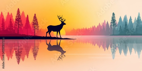 Deer silhouette against a scenic sunset reflecting over a calm lake