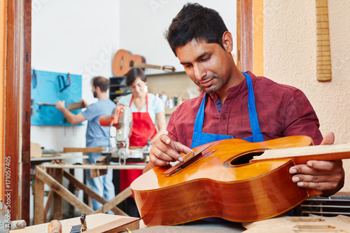 Lehrling in Werkstatt vom Gitarrenbauer