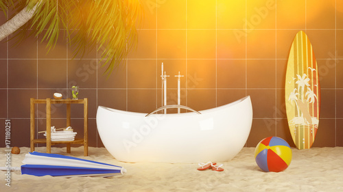 Badewanne mit Sand als Strand als Urlaub Konzept