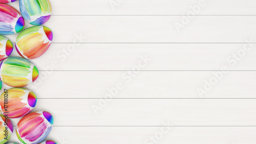 Viele bunte Ostereier auf Holz zu Ostern