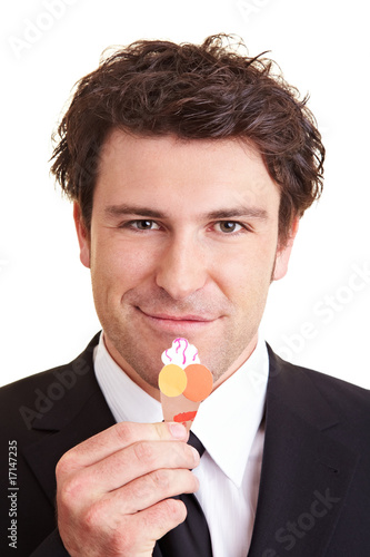 Hand mit Lupe sucht in Portraits als Umfrage und Marktforschung Konzept